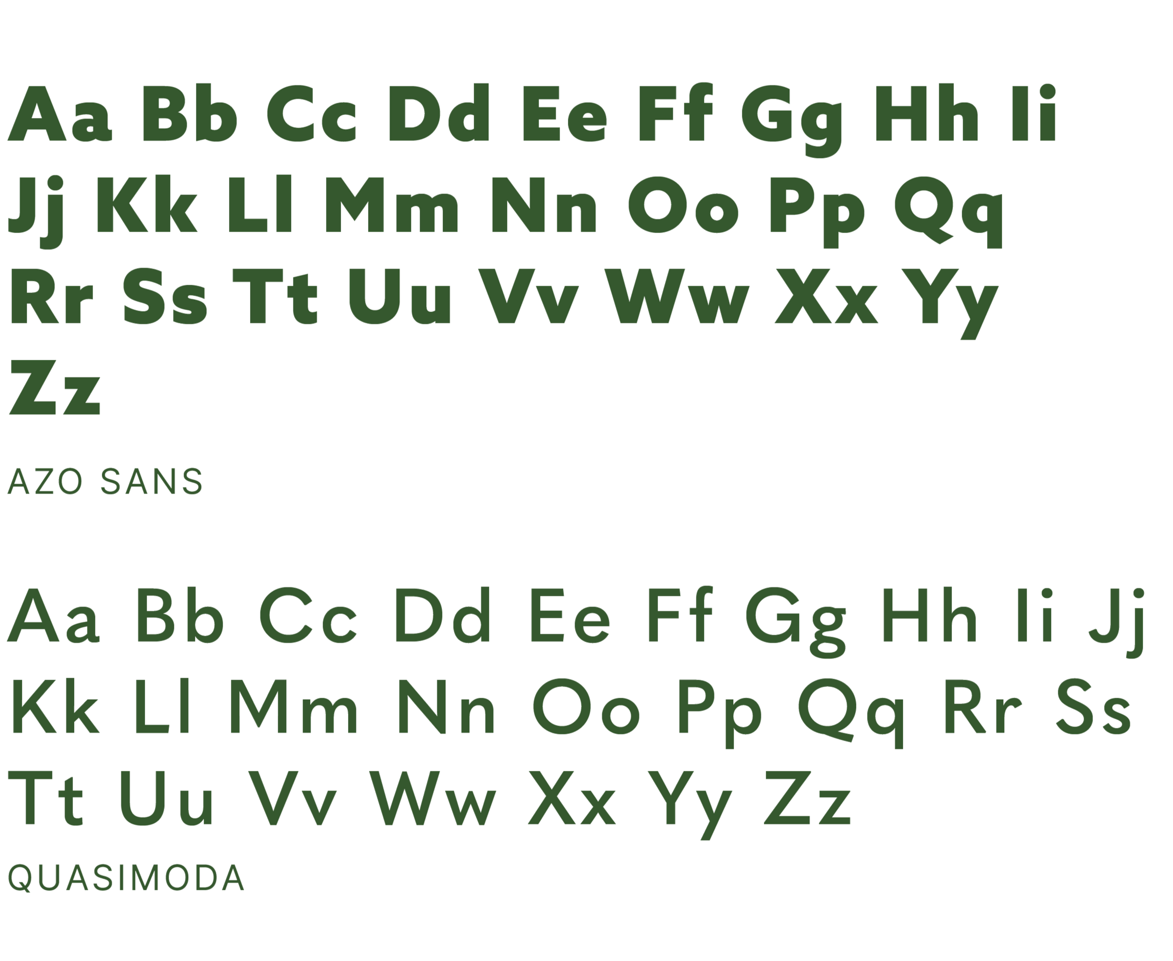 Azo Sans and Quasimoda are complementary typefaces that create a refined balance between contrast and harmony, each bringing its own distinct character while working cohesively together. Azo Sans offers a clean, modern structure with geometric precision, while Quasimoda introduces a softer, more expressive tone. This pairing is further elevated by subtle influences of classic Italian design—marked by elegance, proportion, and a sense of effortless sophistication—resulting in a typographic combination that feels both contemporary and timeless.